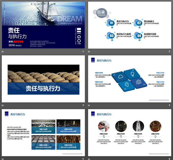 幻灯片模板使用了一搜航行在大海之上的帆船作为背景图片,寓意一个团队的领导者,需要担当带领队伍完成任务的责任,同时需要整个团队有很高的执行力。