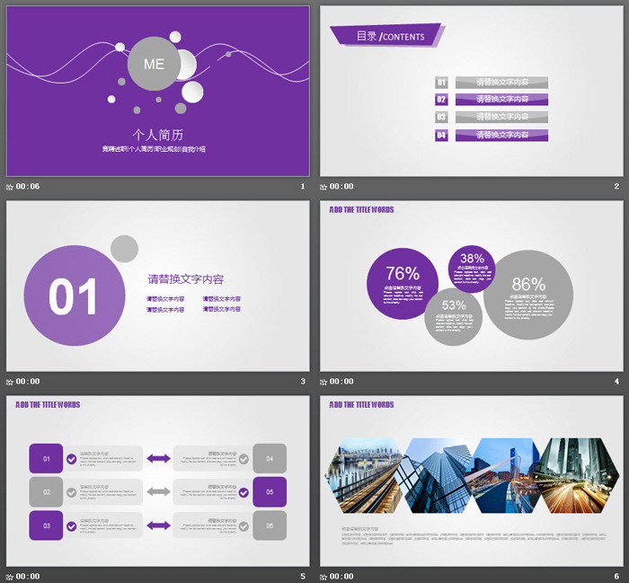 PowerPoint模板内容页面,使用了紫色与灰色的搭配,设计了20张扁平化幻灯片图表。除了图表之外,PPT内容还包括了一些商业建筑、办公场景、户外运动的图片素材,方便制作个人简历PPT使用。