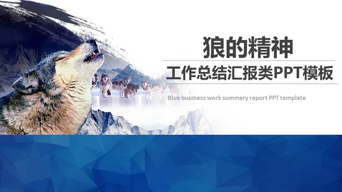 幻灯片模板封面使用了正在吼叫的狼群作为PowerPoint背景图片,后发使用墨迹消除效果,下面用蓝色低平面多边形作为装饰。在右边填写团队精神培训标题。