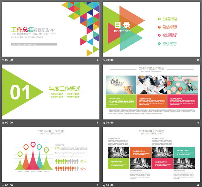 这是一套彩色三角形拼接设计的,年底工作总结PPT模板,共22张。