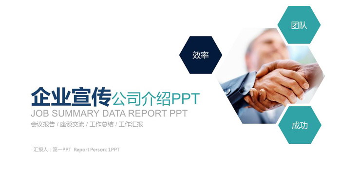 幻灯片模板封面使用了三个蓝色六边形,搭配一张商务人士握手图片作为背景。左侧填写公司介绍标题。让人感觉简洁清爽。
