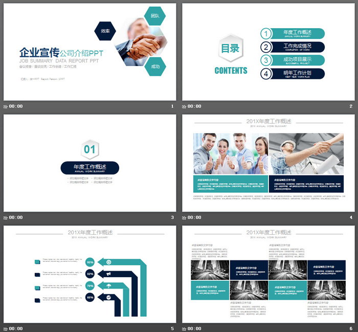 PowerPoint模板内容页面,使用了两种蓝色搭配,设计了19张扁平化幻灯片图表。中间穿插了很多公司图片、企业团队照片、产品图片等。