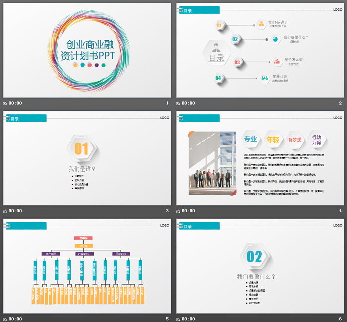 这是一套七彩圆环背景的,创业融资计划书PPT模板,共26张。