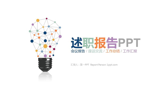 幻灯片使用了一个彩色点线链接设计的灯泡作为个人述职报告PPT封面背景图片。PPT标题使用了彩色黑体设计。