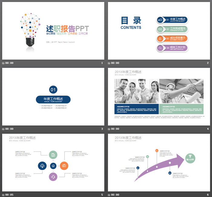 这是一套创意彩色灯泡背景的个人述职报告PPT模板,共22张。