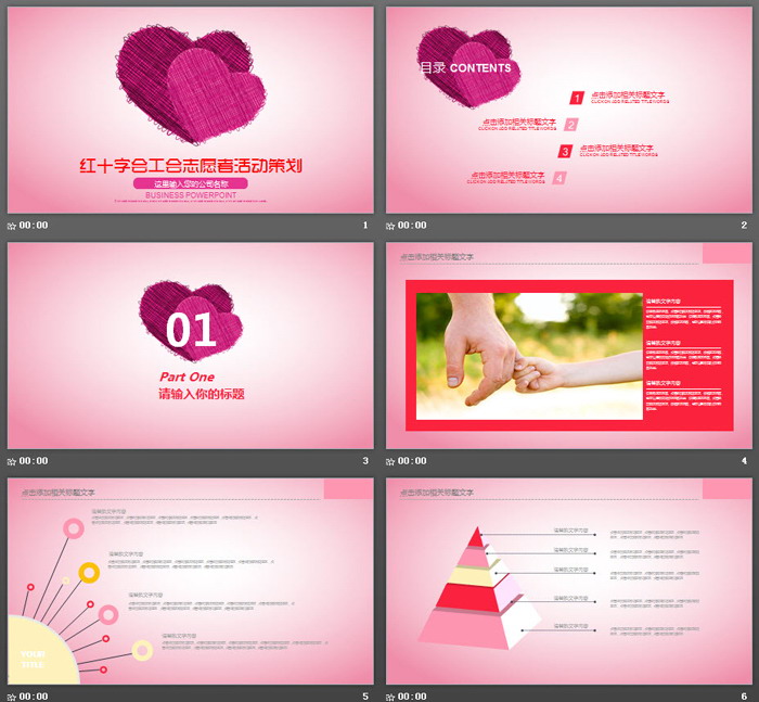 这是一套两颗粉色爱心背景的红十字会志愿者活动策划PPT模板,共22张。
