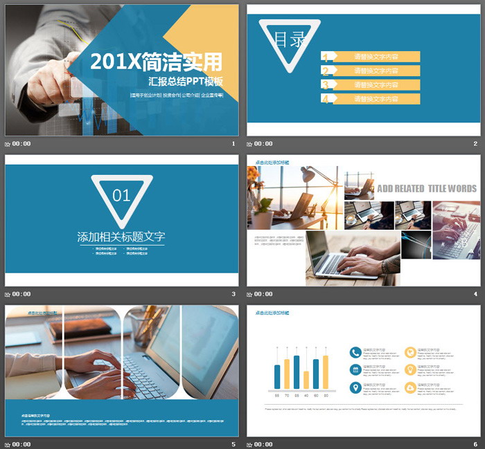 PowerPoint模板内容页面,使用了蓝色与黄色搭配,设计了20张实用幻灯片图表。另外使用了多张职场图片、命中靶心图片、电脑办公图片作为排版素材。