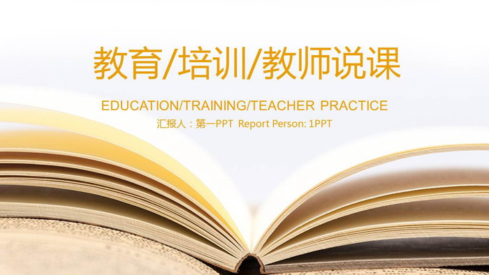 幻灯片模板封面,使用了一张打开的书本作为PPT背景图片。上方用黄色字体填写公开课标题,与背景图片色调统一。
