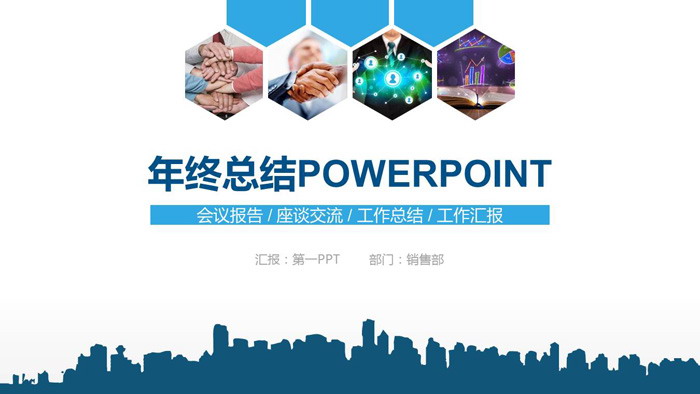 幻灯片模板封面,使用了多个蓝色六边形图形搭配4张六边形商务图片作为装饰。中间使用黑体字填写工作总结PPT标题。最下方使用了蓝色橙色剪影作为背景。