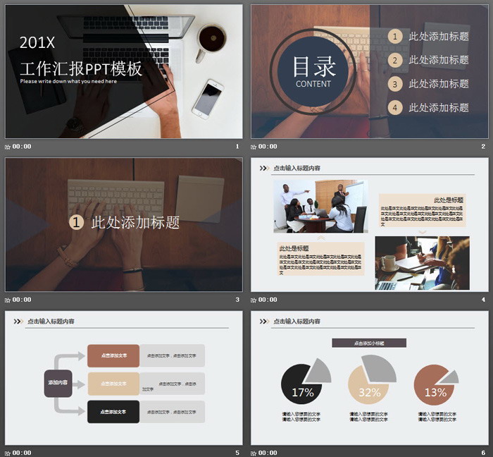 PowerPoint模板内容页面,使用了棕色作为主色调设计了21张扁平化幻灯片图表。方便制作工作汇报幻灯片使用。.PPTX格式;