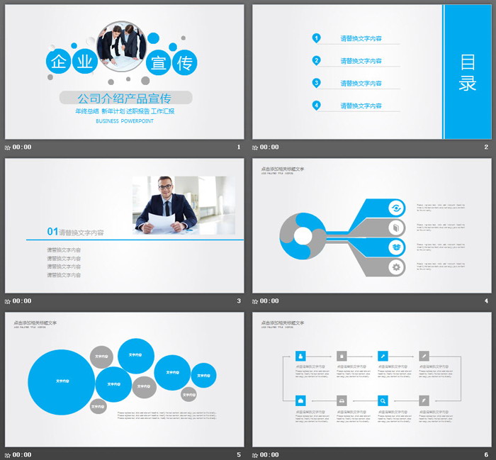 PowerPoint模板内容页面,使用了蓝色与灰色搭配,设计了17张扁平化PPT图表。模板内容图片可以根据自己公司的业务和产品进行编辑修改。