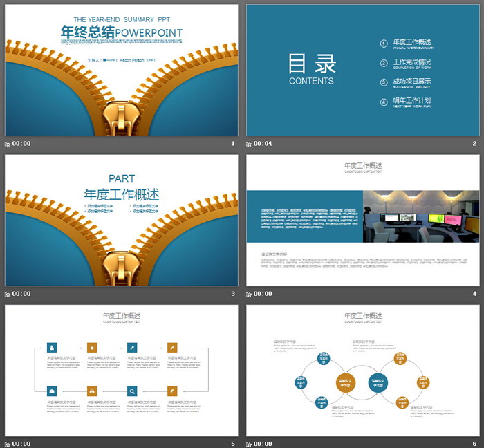 幻灯片模板封面使用了一张拉开的金属拉链作为背景图,中间使用蓝色黑体字填写工作总结PPT标题。