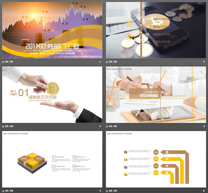 PowerPoint内容页面,使用了职场人物、货币符号、金币、财务报表等图片进行排版。