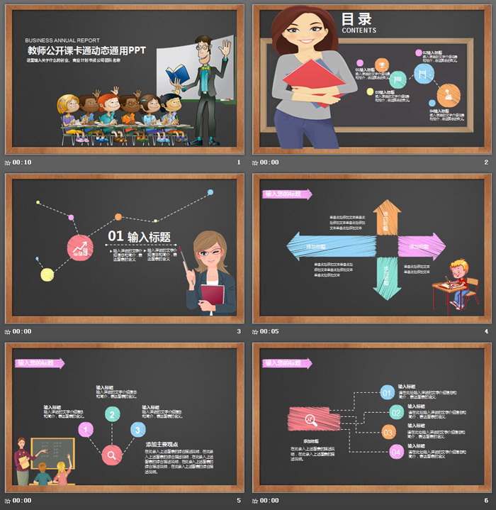 公开课PPT模板内容页面,使用了多个教师与小朋友的卡通插画作为素材,并用彩色粉笔手绘风格绘制了24张幻灯片图表,方便制作公开课PPT使用。
