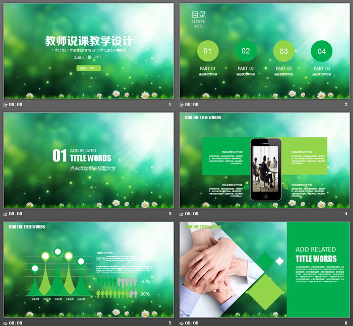 幻灯片模板使用了一张绿色模糊梦幻效果的,森林草地图片作为背景图片。整个画面让人感觉非常舒服,绿色对学生的眼镜也能起到保护作用。