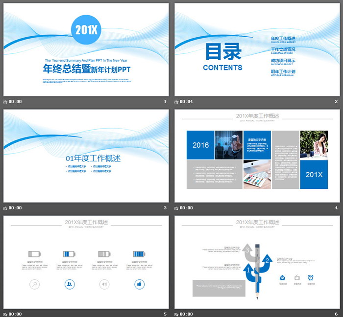 这是一套蓝色空间曲线背景,工作总结计划PPT模板,共22张。