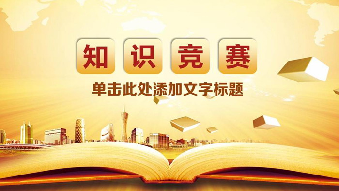 幻灯片模板封面,使用了黄色渐变,打开的金色课本书籍、立方体、金色城市作为背景图片。中间使用四个方形文本框填写知识竞赛PPT标题。