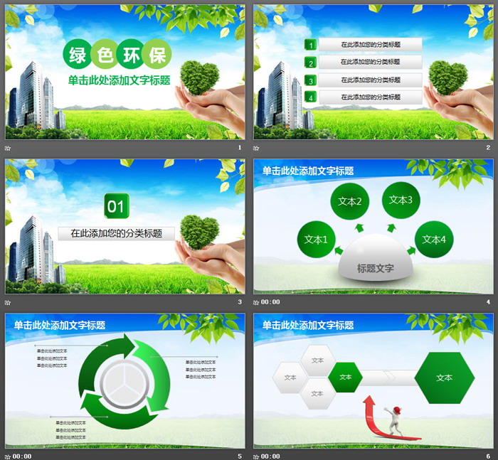 幻灯片模板封面,使用了一张蓝天白云、绿色草地、爱心、绿叶、城市家园的图片作为背景。让人看后,非常向往在这样的环境生活。