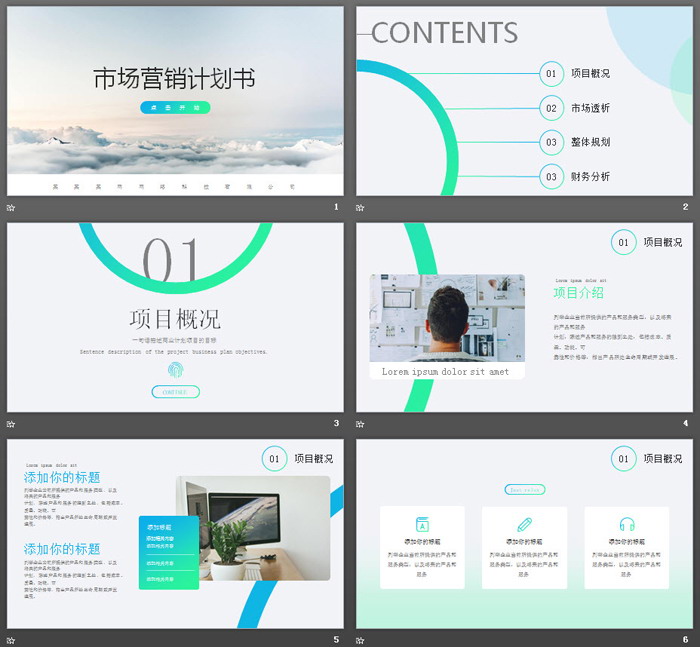 这是一套大气云海背景的,营销方案计划书PPT模板,共26张;