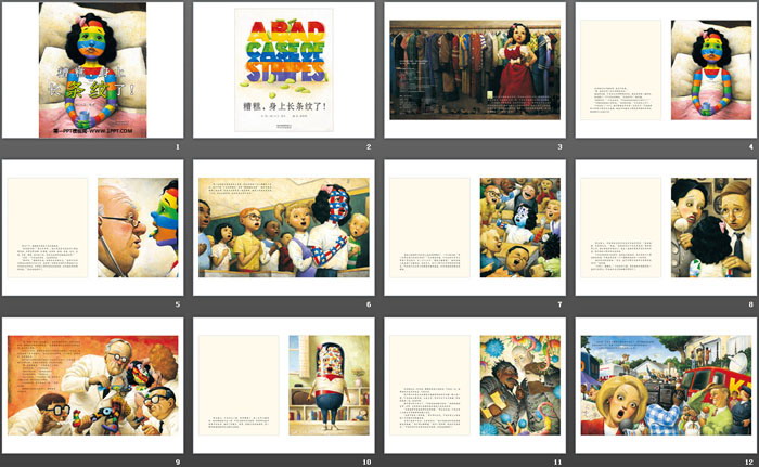 关键词:绘本故事PPT下载,儿童绘本故事幻灯片下载,糟糕,身上长条纹了PPT下载,.PPT格式;