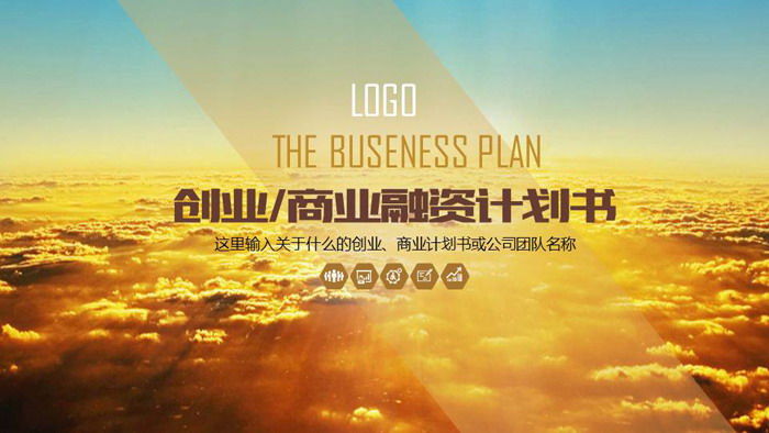 幻灯片模板使用了一张光芒万丈下的金色云层图片作为背景。中间填写商业融资计划书PPT标题文字。界面设计简洁实用。