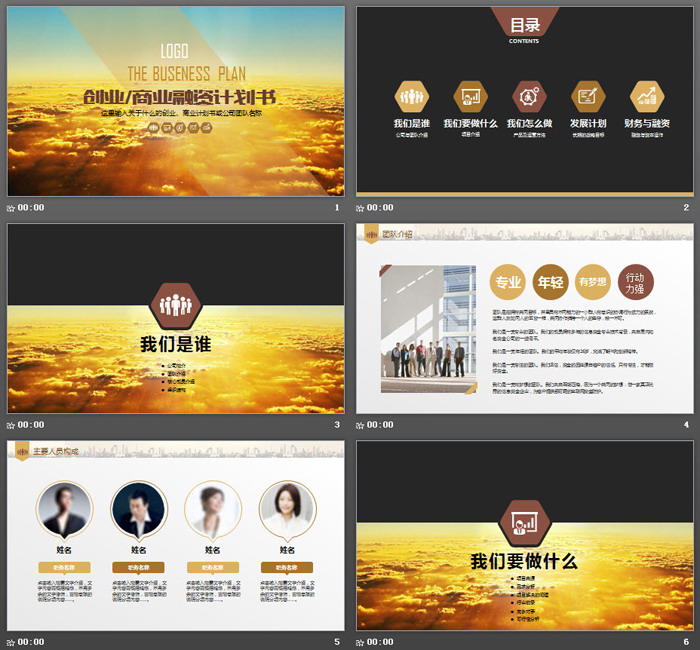 这是一套金色云彩背景的,商业融资计划书PPT模板,共27张;