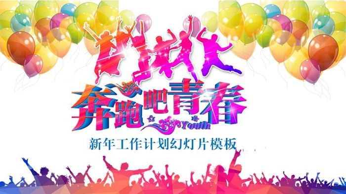 幻灯片模板封面,彩色气球飘在天空,下方是彩色年轻人的人物剪影图片,中间放置奔跑吧——新年工作计划PPT标题。界面设计充满青春与动力。