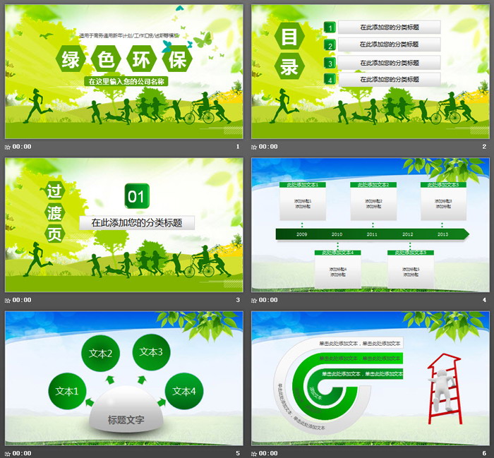 幻灯片模板封面,使用了抽象绿树、蝴蝶、奔跑者、儿童、骑行、宠物等剪影图案作为背景图片。中间填写绿色环保PPT标题。界面设计与环境保护主题搭配。