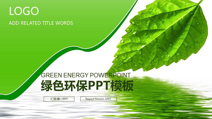 幻灯片模板封面,使用了一张带有水中倒影的绿叶图片作为PPT背景。左侧使用了绿色不规则图形填写绿色环保幻灯片标题。界面设计清新自然,与环保主题非常搭配。