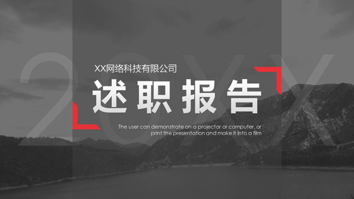 幻灯片模板封面使用了一张灰色自然风景图片作为背景,上面放置了透明可编辑的20XX年份标识,中间使用一个灰色透明色块填写述职报告PPT标题。