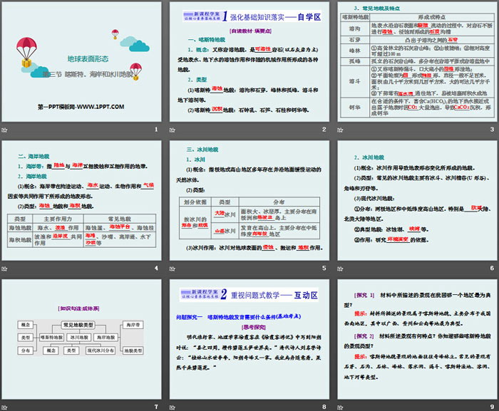 关键词:湘教版高中地理必修一PPT课件免费下载,喀斯特海岸和冰川地貌PPT下载,地球表面形态PPT下载,.PPT格式;