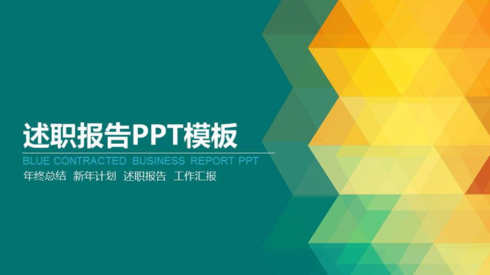 幻灯片模板封面,使用了绿色作为底色,右侧使用炫彩多边形图案作为背景图片。左侧使用白色字体填写述职报告PPT标题。界面设计没有限制主题具有很高的通用性。
