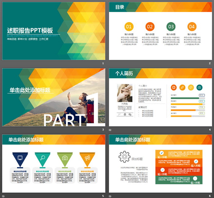 这是一套炫彩多边形背景的员工述职报告PPT模板,共24张;