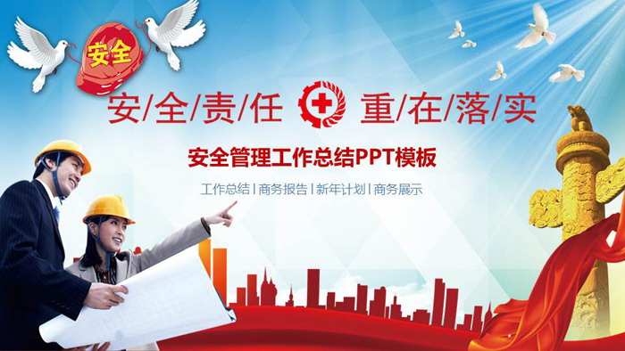 幻灯片模板封面,使用了手拿工程图纸头戴安全帽的工程师、华表、红色彩带、城市剪影作为背景图片。中间填写安全管理工作总结PPT标题。