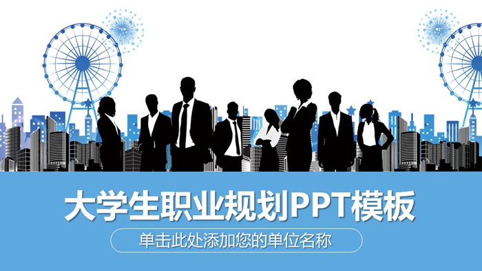 幻灯片模板封面,使用了黑白城市剪影、职场人物剪影作为背景图片。下方使用蓝色色块填写大学生职业规划PPT标题。界面设计与职场主题搭配。