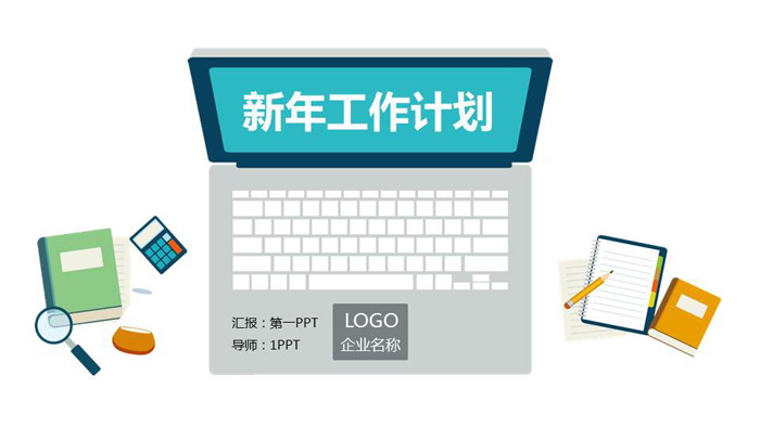 幻灯片模板封面,使用了卡通扁平化的办公桌面作为背景图片。在电脑背景图片显示器中间填写工作总结计划PPT标题文字。界面设计清新简洁。