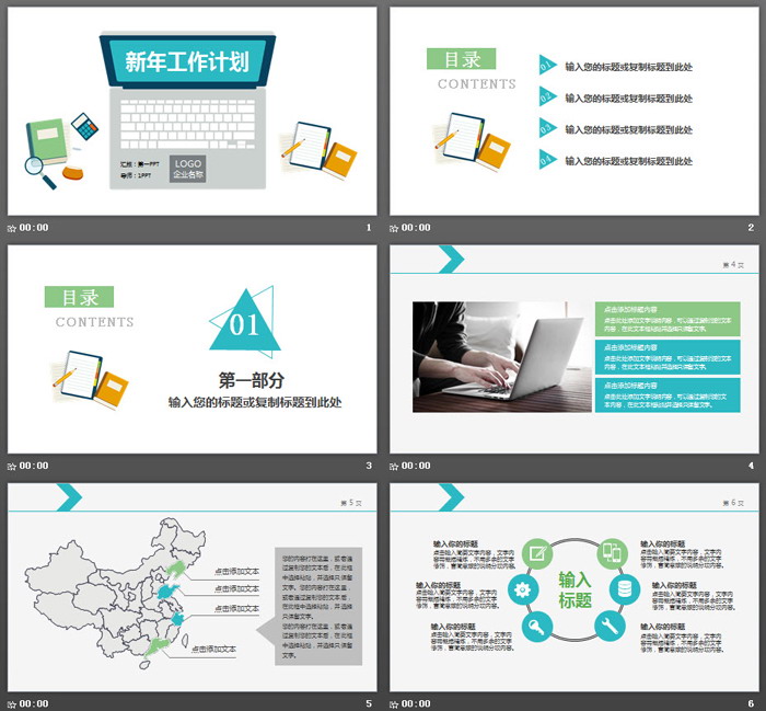 PowerPoint模板内容页,由25张蓝色绿色搭配的扁平化幻灯片图表制作。另外使用了商务人物剪影图片、记事本图片、职场白领、办公场景等图片进行排版编辑。