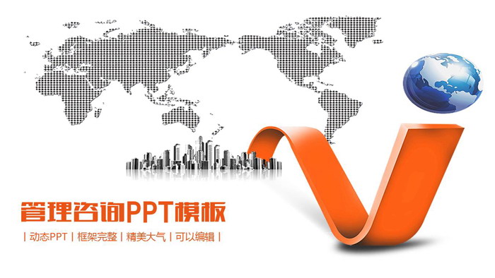 幻灯片模板封面,使用了灰色世界地图点阵图、立体城市建筑模型、橙色立体曲线、地球图片作为背景。左下角填写管理咨询PPT标题。界面设计充满商务气息。