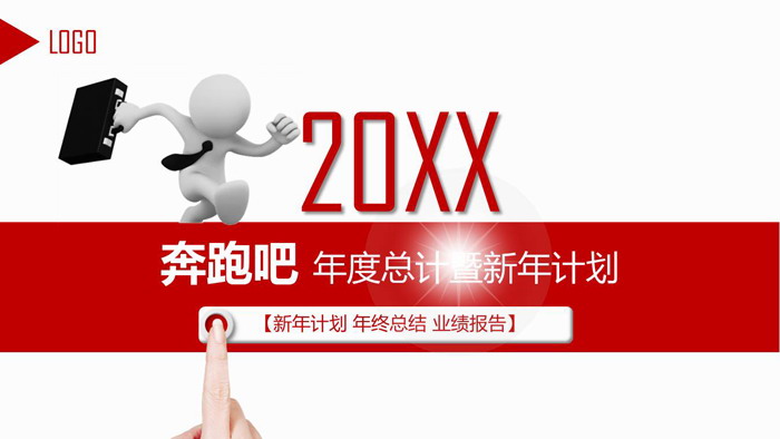 幻灯片模板封面,使用了一个手拿公文包、戴着领带的白领立体小人作为背景图片。右侧填写工作总结计划年份,下方使用动态手势动画引出PPT标题。界面设计与奔跑吧主题搭配。