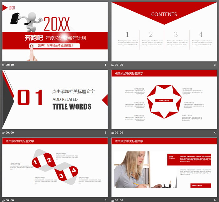 这是一套白色小人背景的,奔跑吧主题,工作总结计划PPT模板。共26张;