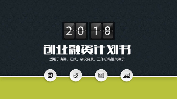 幻灯片模板封面,使用了浅绿色与深绿色搭配作为底图。中间放置一个翻页日历PPT动画,下方填写商业融资计划书PPT标题。界面设计简洁实用。