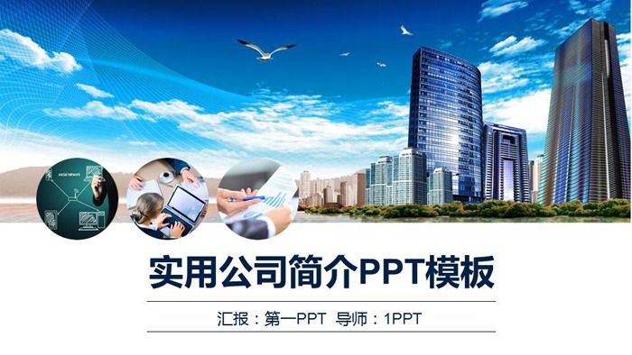 幻灯片模板封面,使用了蓝天白云、海鸥、现代化写字楼办公建筑等作为PPT背景。左侧放置三个圆形,使用与公司有关的图片填充,图片可编辑。