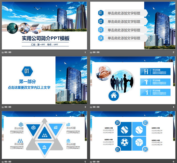 这是一套蓝天白云高楼大厦背景的,公司简介PPT模板,共27张;
