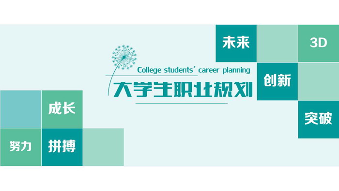幻灯片模板封面,使用了蒲公英图案、绿色方块作为装饰。中间填写大学生职业规划PPT标题。界面设计清新简洁。