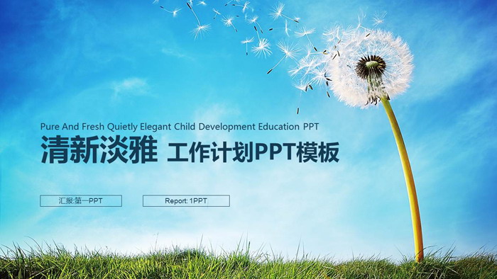 幻灯片模板封面,使用了蓝天白云、草地、蒲公英作为背景图片。左侧填写工作计划PPT标题以及汇报人等信息。界面设计清新淡雅。