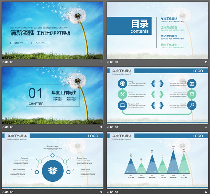 这是一套清新蒲公英背景的,新年工作计划PPT模板,共26张;