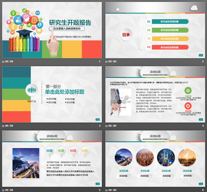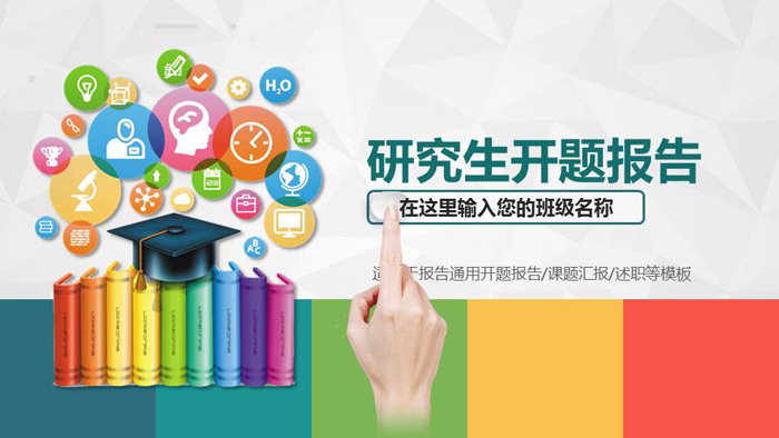 幻灯片模板封面,使用了UI风格的书籍图片、教育行业图标、彩色渐变色块、灰色低平面多边形作为背景。右侧使用动态手势动画引导出,研究生开题报告PPT标题。