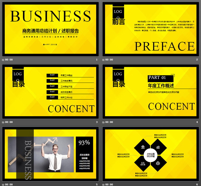 这是一套黑色与黄色搭配的,个性欧美风格工作总结PPT模板,共26张;