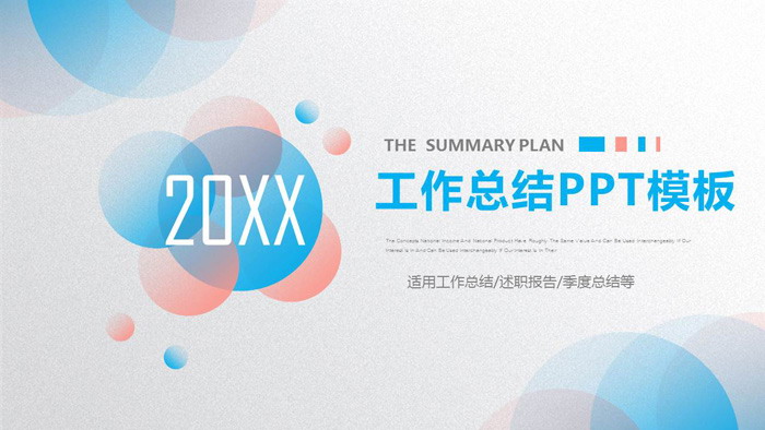 幻灯片模板用蓝色与红色进行搭配设计。PPT模板封面,使用了多个大小不一,透明不同的圆形作为背景。中间填写工作总结计划PPT标题文字。整个模板设计非常实用。