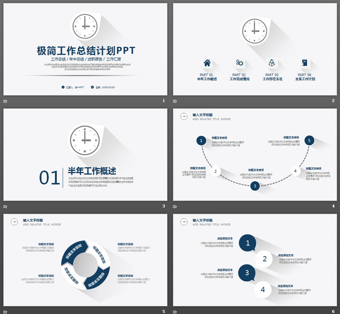 这是一套带有阴影效果的,极简时钟背景的新年工作总结计划PPT模板,共23张;